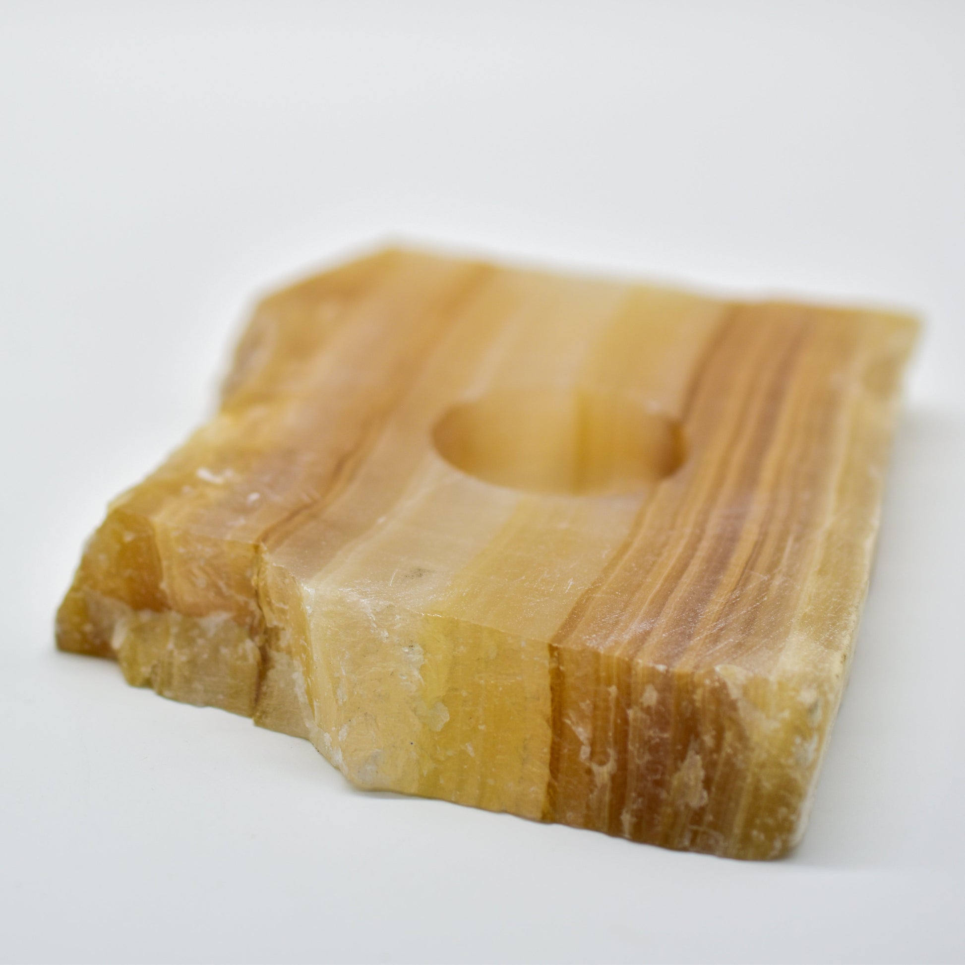 Natural Amber Onyx slabs are hand cut and polished on top, hold 1.5" tea light or votive candle. Each piece is unique in color, shape and size! Measurements are between L 4-5" W 4" x D .75"