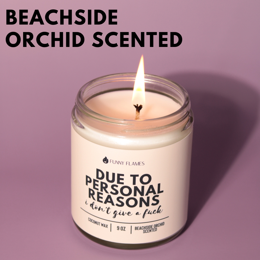 A bold expression of liberation and self-assurance. Infused with the captivating aroma of beachside orchid, this candle transports you to the serenity of ocean breezes and blooming flowers. As its flame flickers, allow the enchanting fragrance to envelop you, creating an atmosphere of carefree confidence. The candid statement on the label is a testament to prioritizing your own well-being. Whether you're seeking solace from external pressures or embracing a newfound sense of empowerment, this candle is your declaration of independence. Let the soothing scent inspire you to embrace life on your own terms, unapologetically and free from unnecessary concerns.