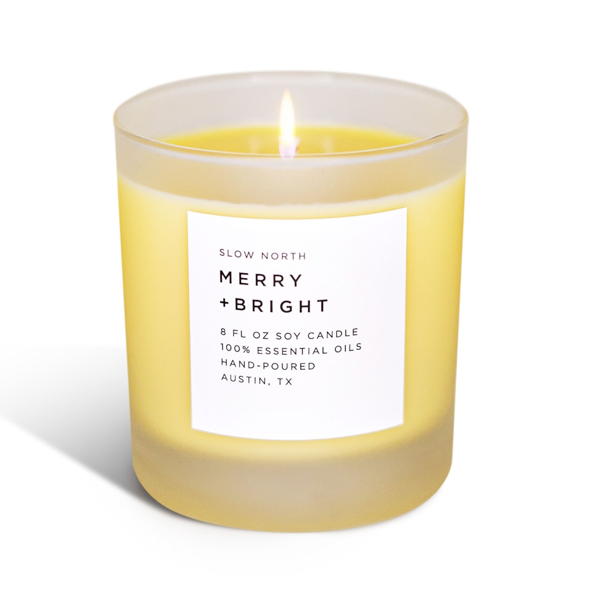 Embrace the festive joy of our Merry + Bright candle , a delightful blend that brings the warmth and cheer of the holidays into your home. Handcrafted in Austin, Texas, this eco-friendly candle combines the crisp, refreshing aroma of Northern Fir with the sweet vibrancy of Clementine and the cozy warmth of Clove. It’s the perfect way to create a cozy, nostalgic atmosphere for winter celebrations and quiet nights alike.