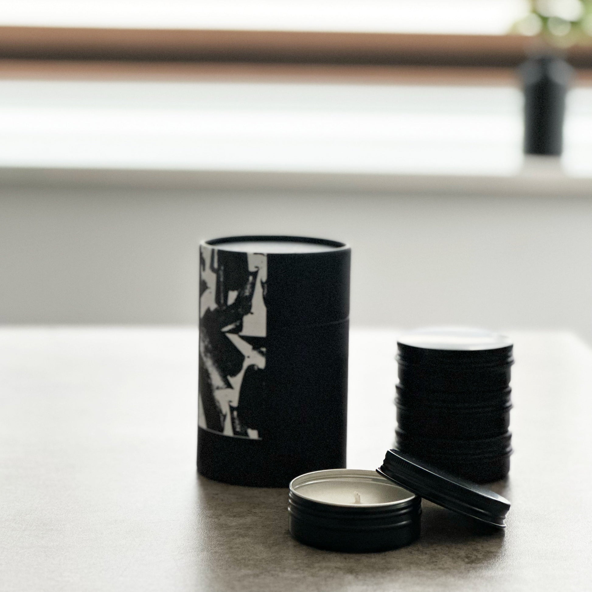 Discover the four scents of postmodernform's signature collection with this perfectly sized discovery set. The 2oz tins are perfect for discovering your favorite scents from the collection before buying larger candles, taking your favorite candles while traveling, or gifting to others to discover theirs. The collection includes a 2oz candle each of the following 4 scents: at peace with myself - lavender + cinnamon clear the air - white sage + lavender lost in thought - balsam + saffron + clove new vibes - sea salt + orchid 2oz | 56g (8oz total | 226g total) 10 hour burn time each (40 hour burn time total) *Please note: Smaller candles are ideal for smaller areas like bathrooms or small offices, but may not effectively fragrance larger rooms. For that, we suggest our larger 8oz candles. Here is a link to the Signature Collection - 8oz candles. Candles from postmodernform are always 100% soy wax, 100% cotton wicks, always cruelty-free. Small-batch, handpoured in San Francisco or Raleigh, USA. FREE SHIPPING on all orders $50+