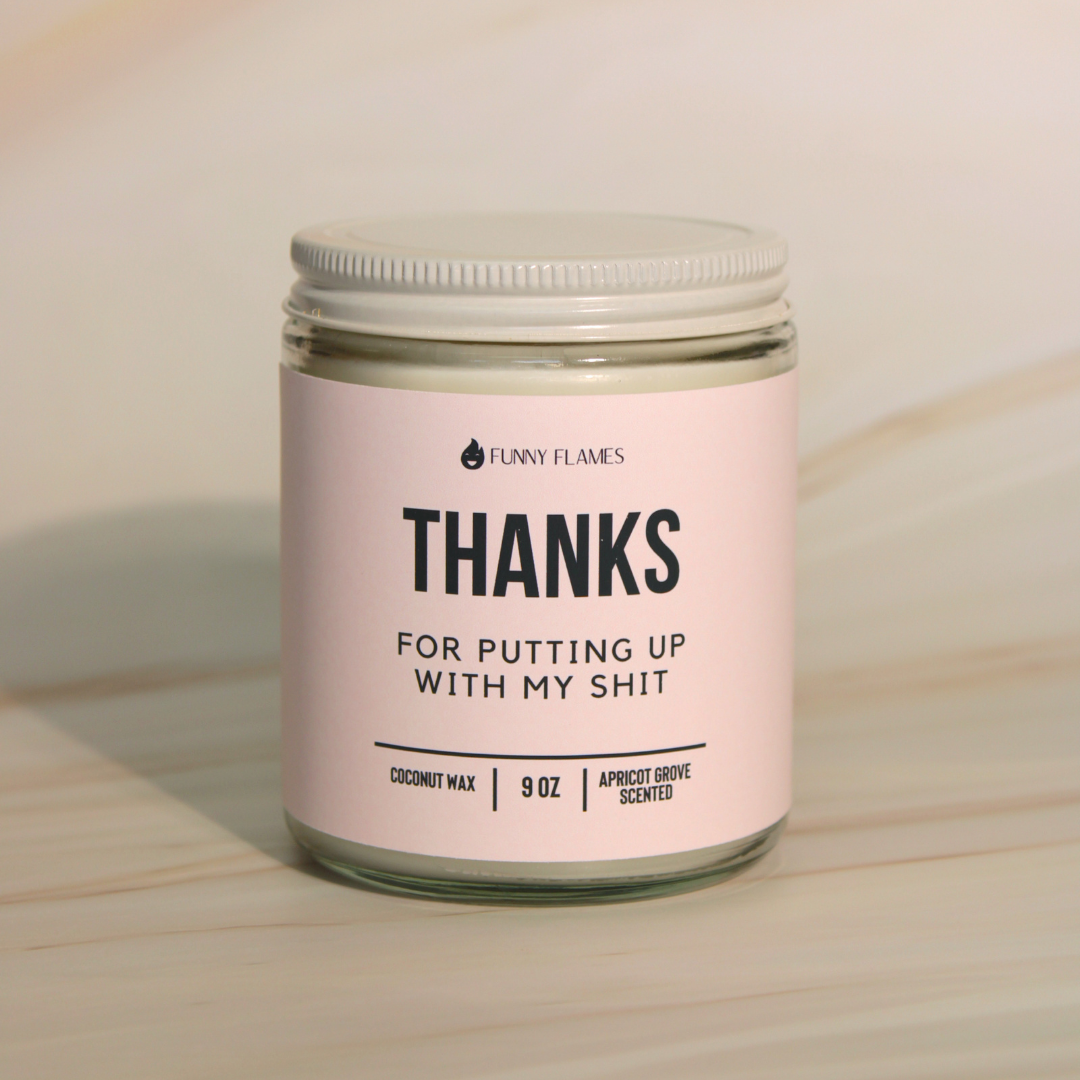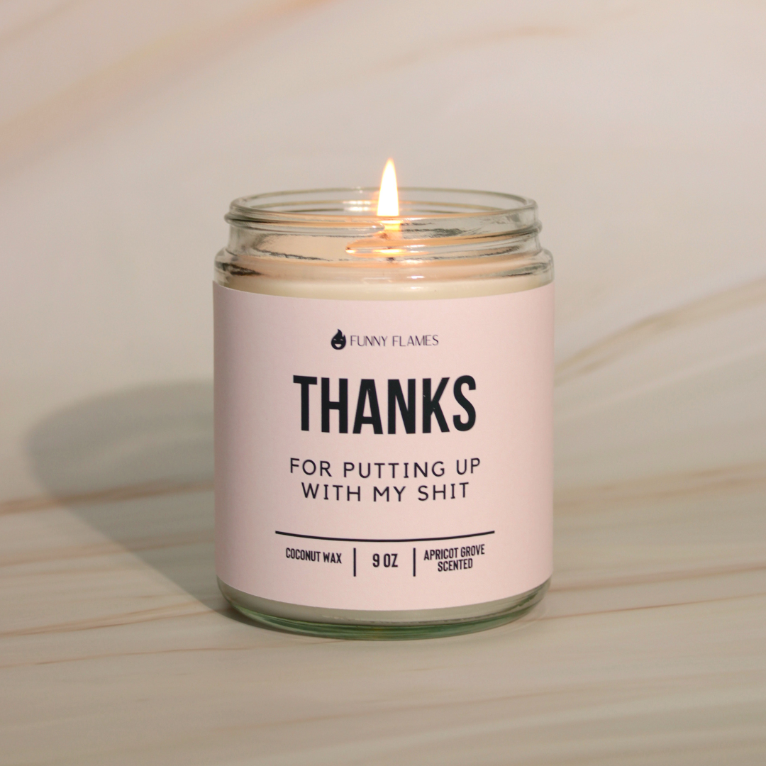 "Thanks For Putting Up With My Shit" candle, the perfect gift for that special someone who deserves an award for dealing with your shenanigans! Crafted with a coconut apricot wax blend that's as smooth as your apologies and as sweet as an apricot grove in bloom.